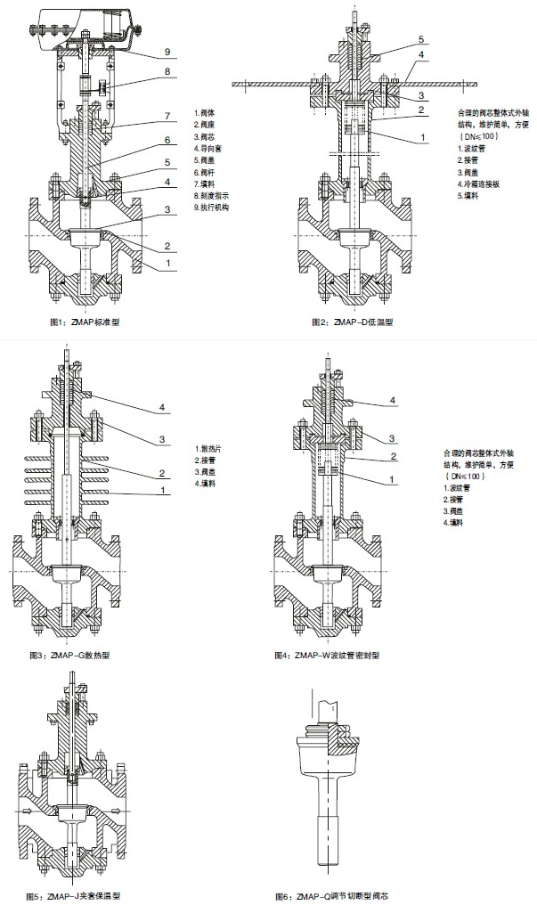 | 上阀盖 | 标准型-17~+230℃、散热型+230~+450℃、低温型-60~-196℃、波纹管密封型-40~+350℃ |